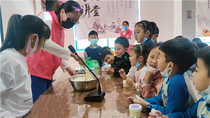 提及冰淇淋,現場的小朋友一個個興奮得歡呼雀躍。商場里出售的冰淇淋中多含有較多的添加劑,如何給孩子制作一款無添加劑的冰淇淋成了這堂親子互動課的目的。群益村美食老師現場講解打發雞蛋及雞蛋牛奶混合液的過程,演示打發淡奶油、攪拌混合,加入果醬等改變口味的方法和分裝小瓶等步驟。期間大家認真聽講解,小朋友們眼睛牢牢地盯著講臺,仔細觀察每一個步驟,還時不時地向美食老師發問,興致高漲。孩子們一邊品嘗著冰淇淋,一邊在自己的冰淇淋罐盒上貼上自己所愛口味的標簽后讓美食老師裝滿剛做的冰淇淋,跑前跑后忙得不亦樂乎!