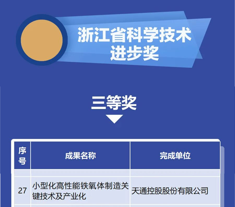 在7月11日下午召開的全省科技創(chuàng)新大會上,2021年度“浙江省科學技術(shù)進步獎”等一系列獎項揭曉,天通控股股份有限公司“小型化高性能鐵氧體制造關(guān)鍵技術(shù)及產(chǎn)業(yè)化”項目榮獲浙江省科學技術(shù)進步獎三等獎。這是天通公司磁性材料第八次獲得浙江省科學技術(shù)進步獎。
